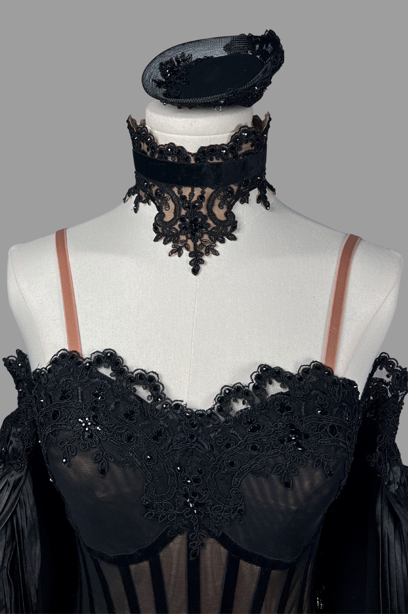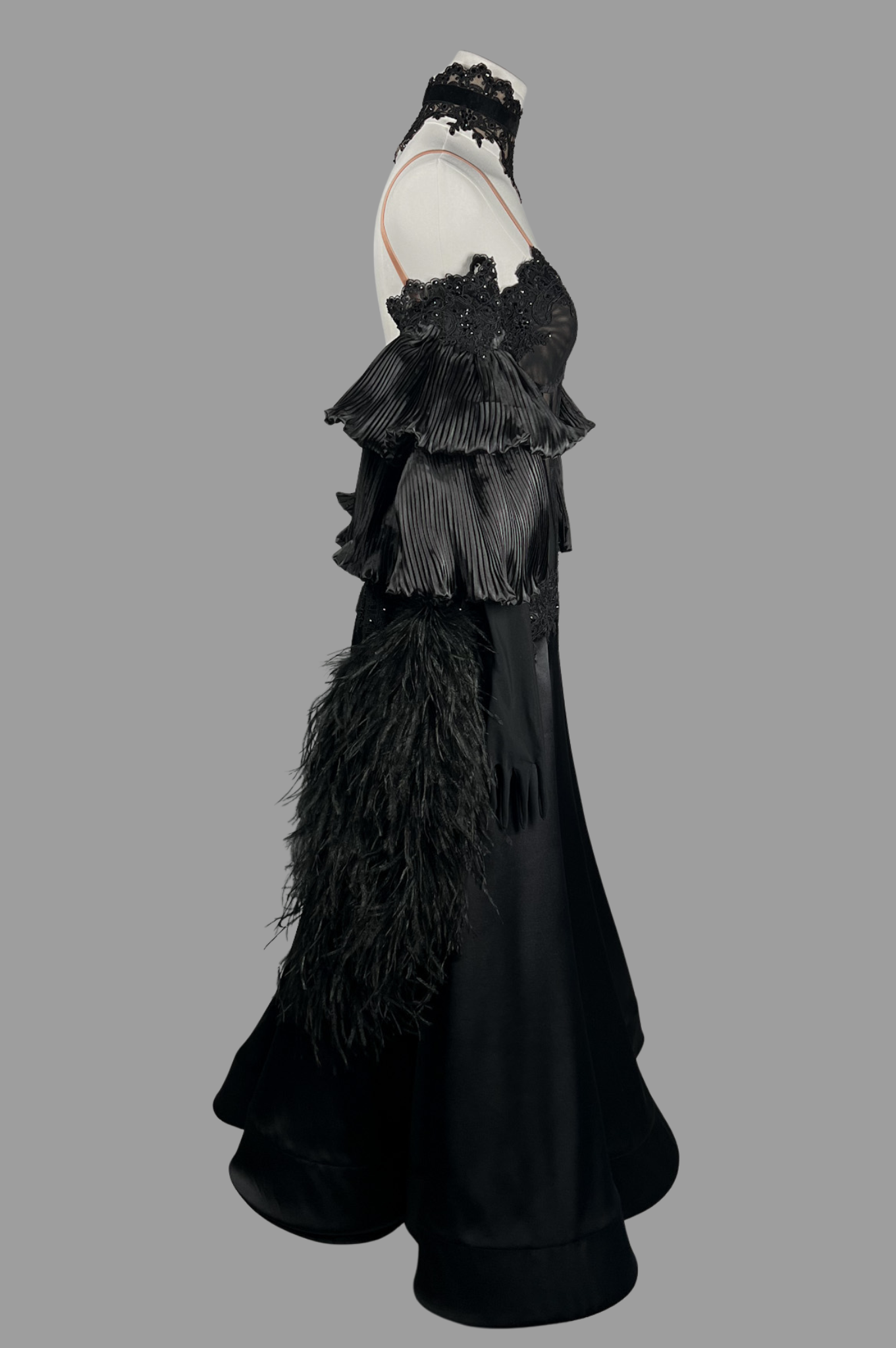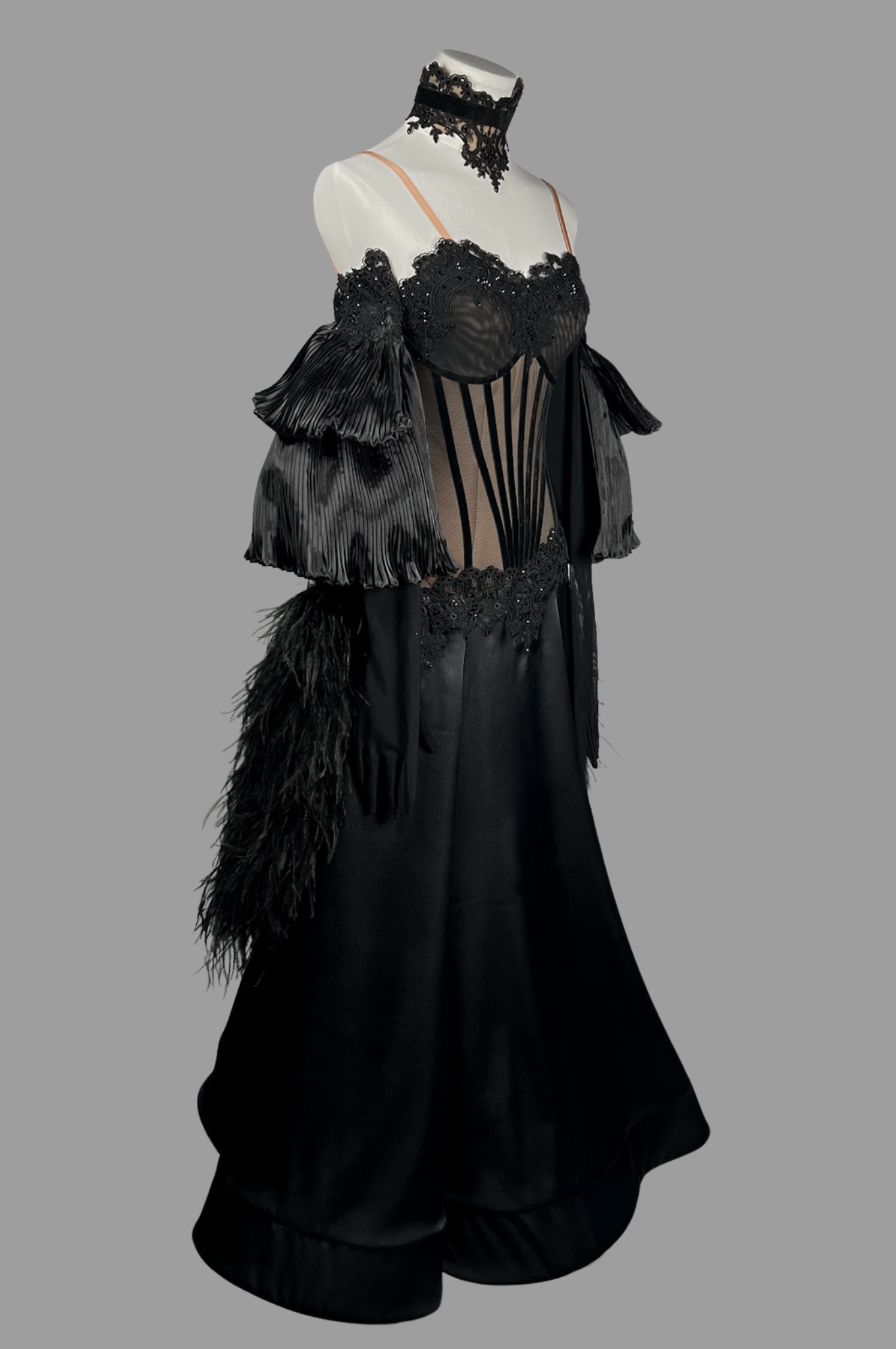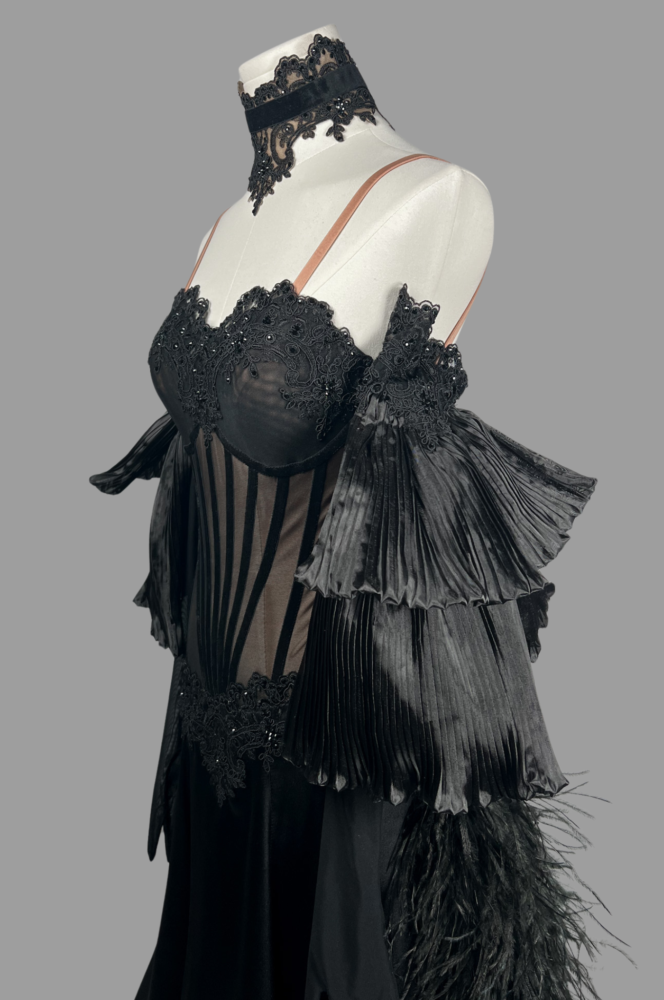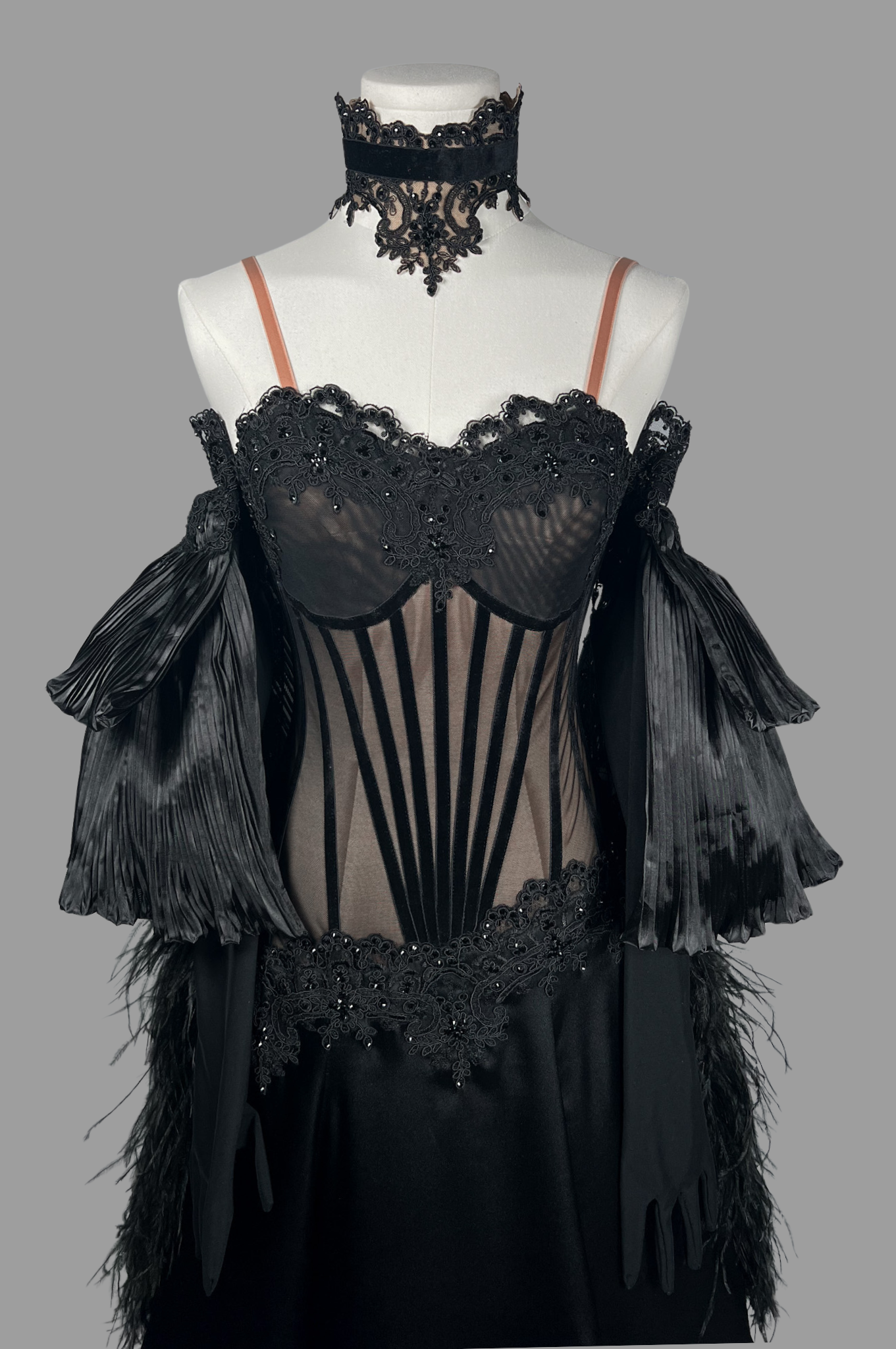Stretch lycra; stretch mesh; georgette; satin; crystal embellishments; feather BOA.
