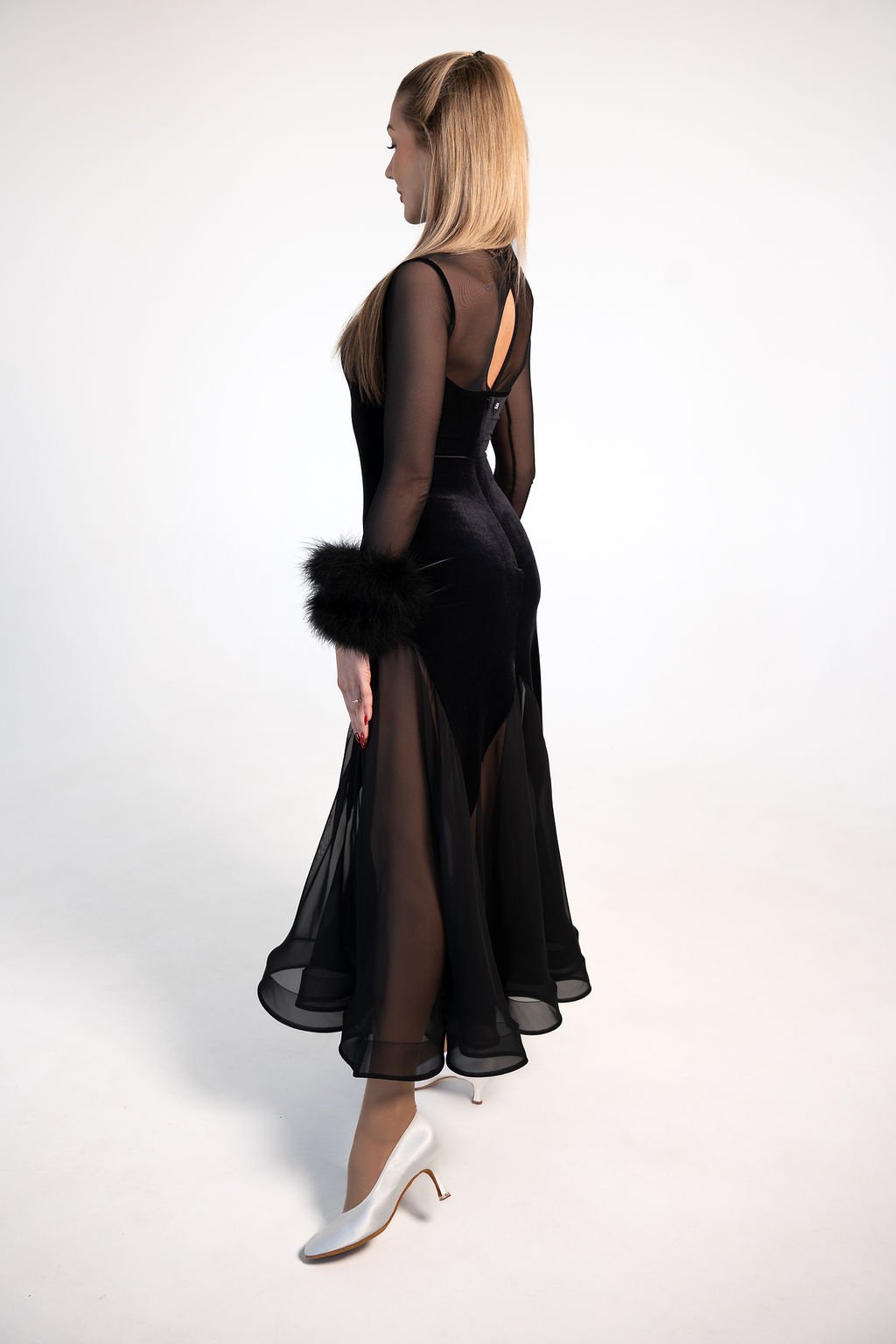 Velvet upper part with delicate lace neckline and marabou detail on the wrists.