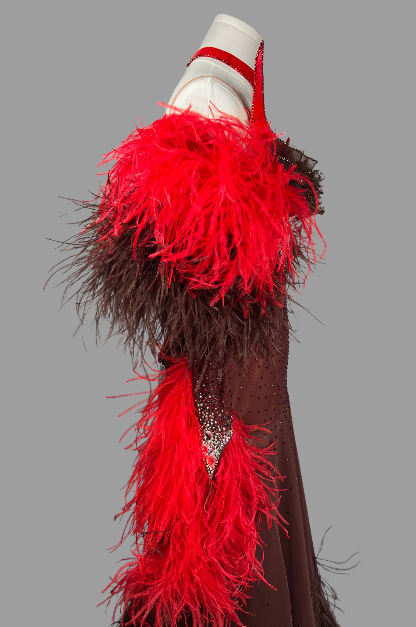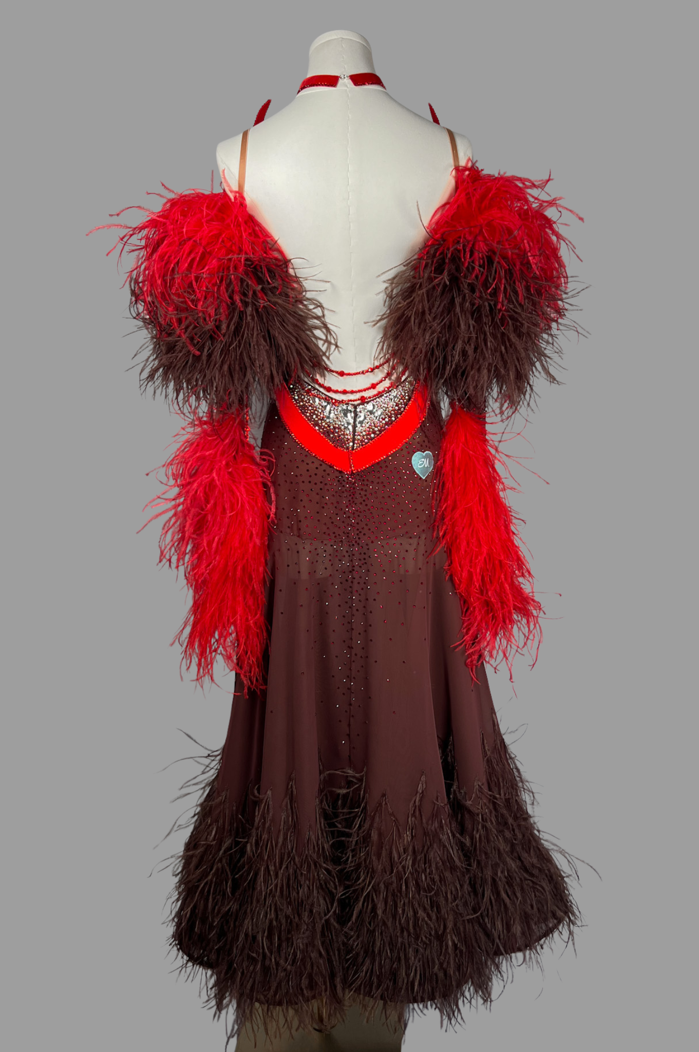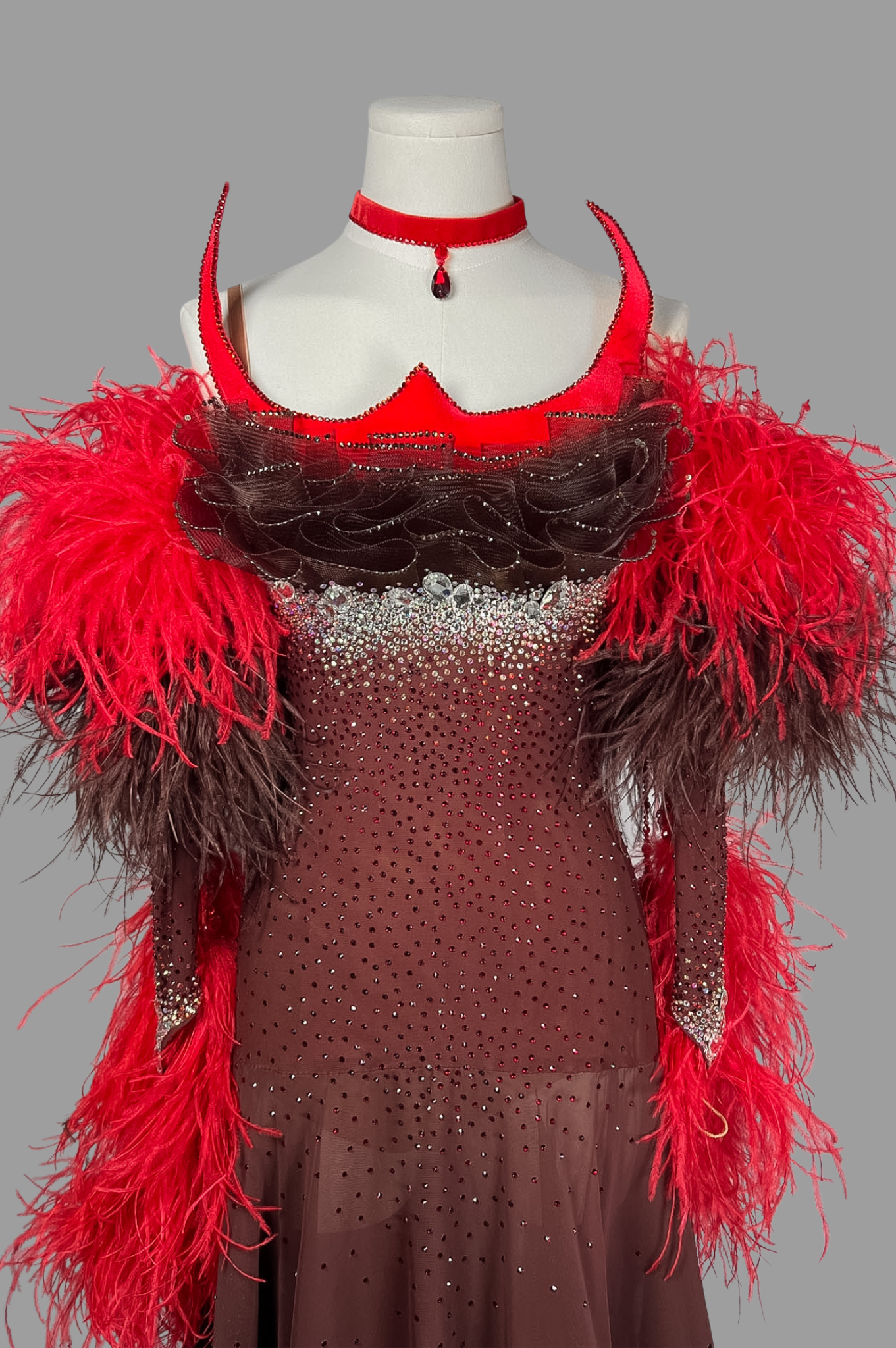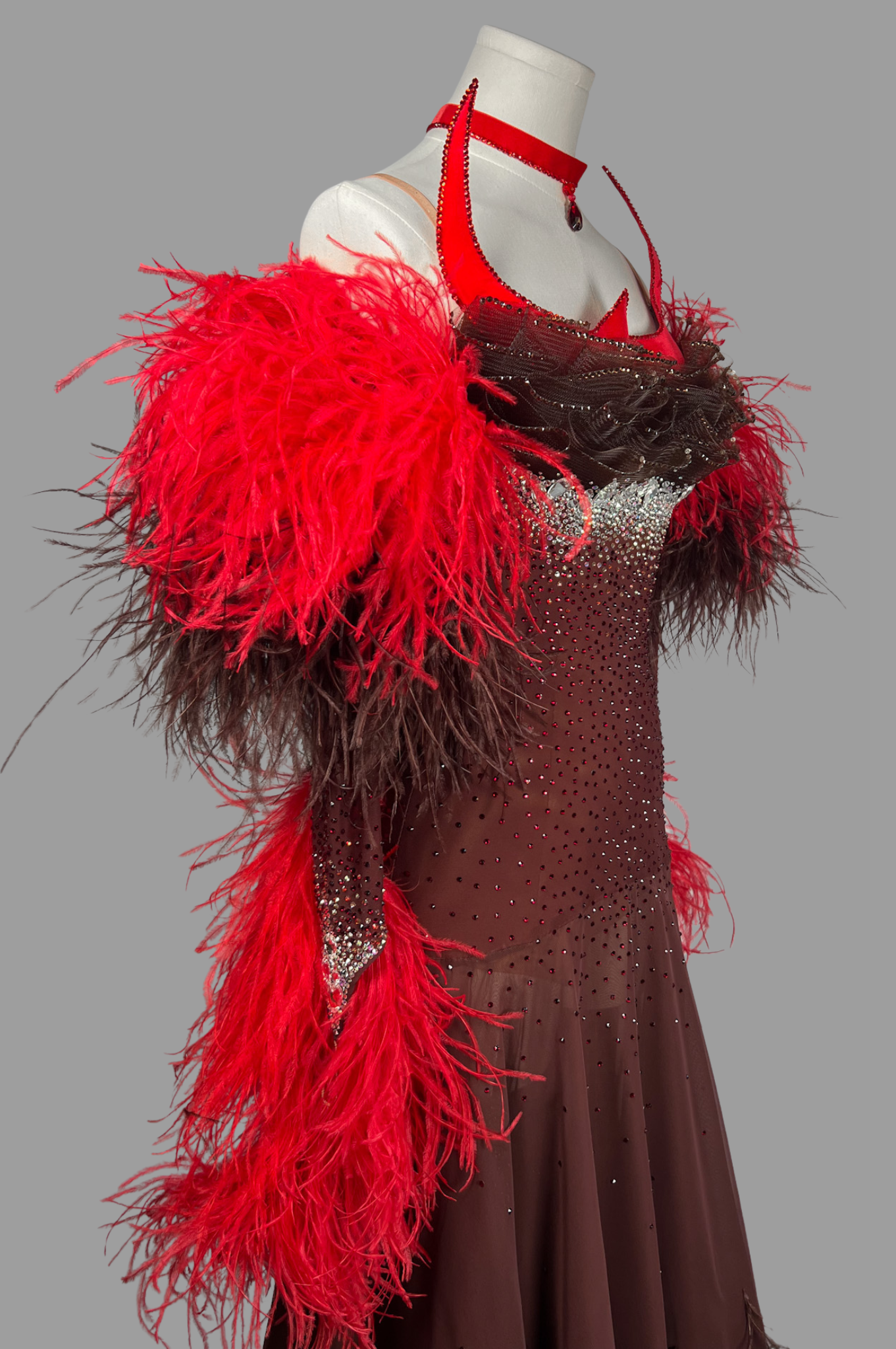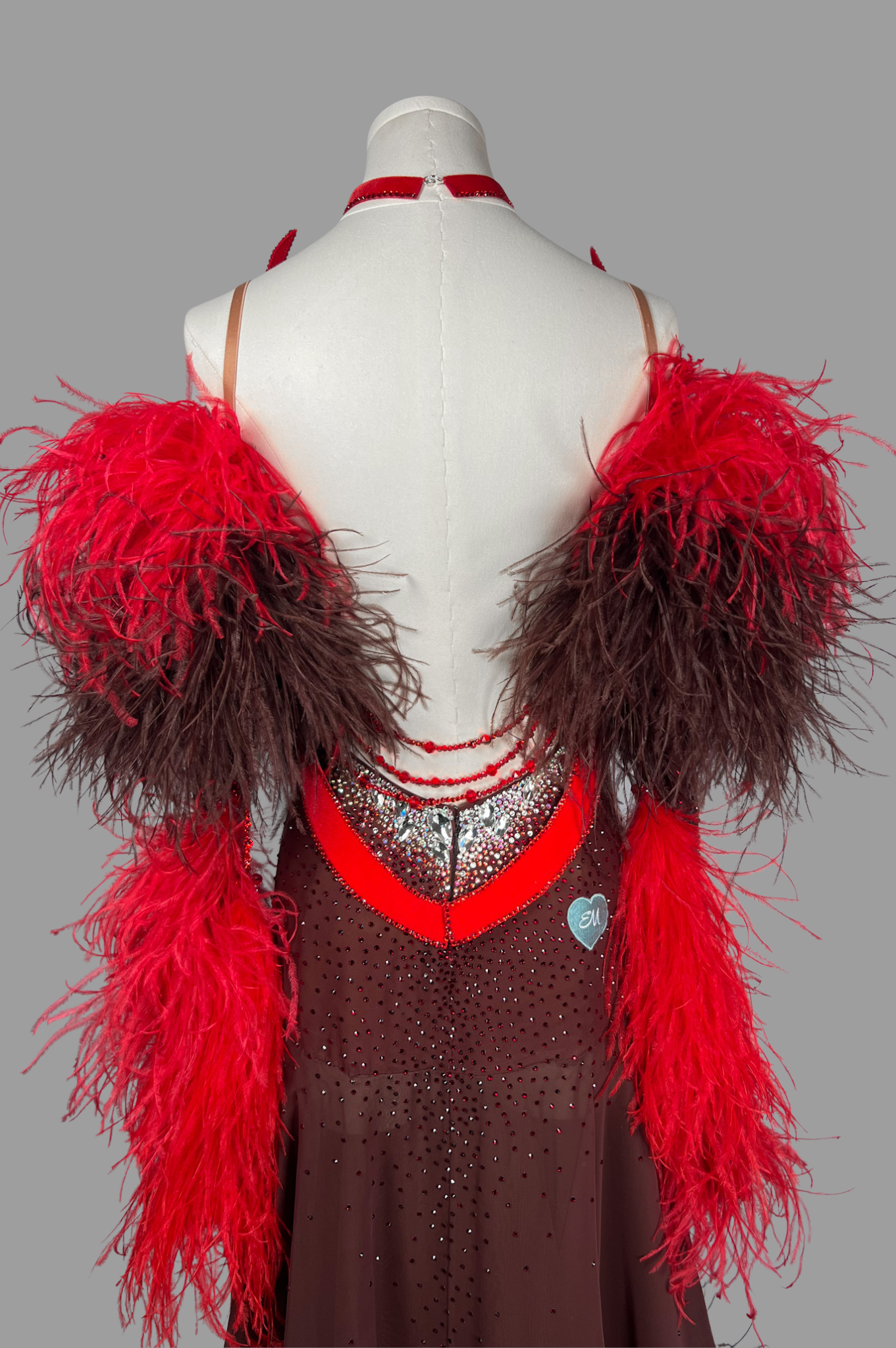 Stretch lycra; stretch mesh; georgette; crystal embellishments; feather BOA.